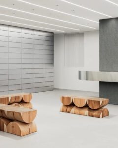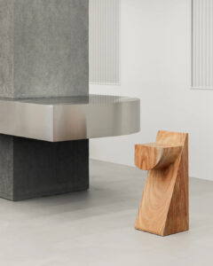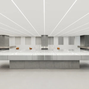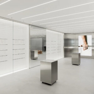 Inspired by Brutalist architecture, the 3229-square-foot space is centered around a nearly 24-foot floating counter display. The walls and architectural columns were transformed into additional displays of the jeweler’s products. Designed in collaboration with Torafu Architects (Tokyo), the concrete-textured columns are visually contrasted with sleek stainless steel finishes throughout the store. To balance the industrial aesthetics and add warmth to the space is the in-store seating, designed by Japanese woodworker Kojiro Kitada and created with locally sourced pine and oak wood.